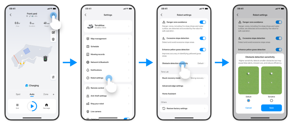 Ustaw czułość wykrywania przeszkód w Terra Lab na wartość Sensitive (Wrażliwa), aby wykrywać mniejsze obiekty (o wymiarach około 5×5 cm) i chronić przedmioty, takie jak małe zabawki na trawniku.