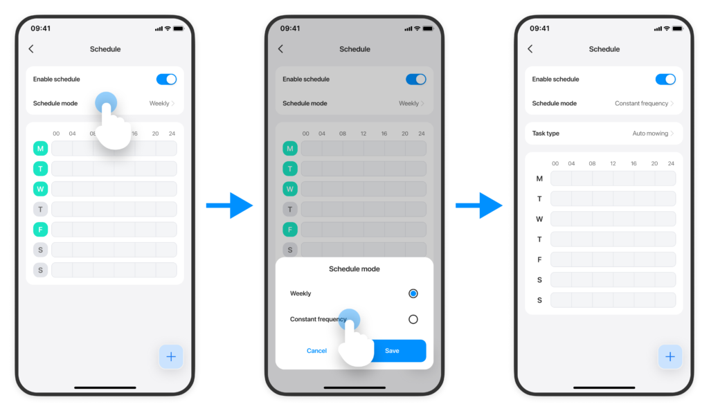 Przełącz się na tryb stałej częstotliwości, aby ustalić stały harmonogram koszenia dla całej mapy lub przypisać różne częstotliwości do każdej strefy.