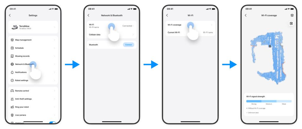 Robot rejestruje teraz siłę sygnału Wi-Fi podczas wykonywania zadań i tworzy mapę zasięgu. W połączeniu z inteligentnymi teksturami map pomaga w wykrywaniu słabych punktów i poprawianiu zasięgu.